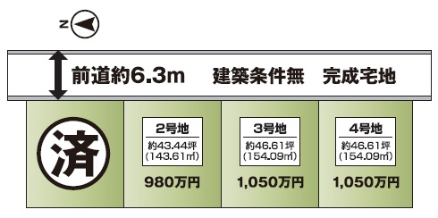 前面道路 | 販売価格 980万円~(1区画分の土地価格) | 土地面積 | 公簿143.61㎡他 | | 坪数 | 約43.44坪他 | | 地目 | 宅地 | | 建ぺい率 | 60% | | 容積率 | 200% | | 前面道路 | 東側 幅員約6.3m | | 所在地 | 和歌山市加納375-1他 | | 交通 | JR阪和線「紀伊中ノ島」駅 まで徒歩約27分 | | 学校区 | 和歌山市立四ヶ郷上小学校 和歌山市立紀之川中学校 | | 備考 | 建築条件無し! 1.5区画や2区画の購入も可 |