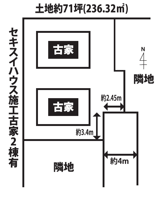 | 販売価格 2,880万円 | 土地面積 | 公簿236.32㎡ | | 坪数 | 約71.48坪 | | 地目 | 宅地 | | 建ぺい率 | 60% | | 容積率 | 200% | | 前面道路 | 東側 幅員約4m | | 所在地 | 和歌山市東高松2丁目7-21 | | 交通 | | | 学校区 | 和歌山市立高松小学校 和歌山市立西和中学校 | | 備考 | 2棟分古家付の土地 高松小学校まで徒歩5分 |