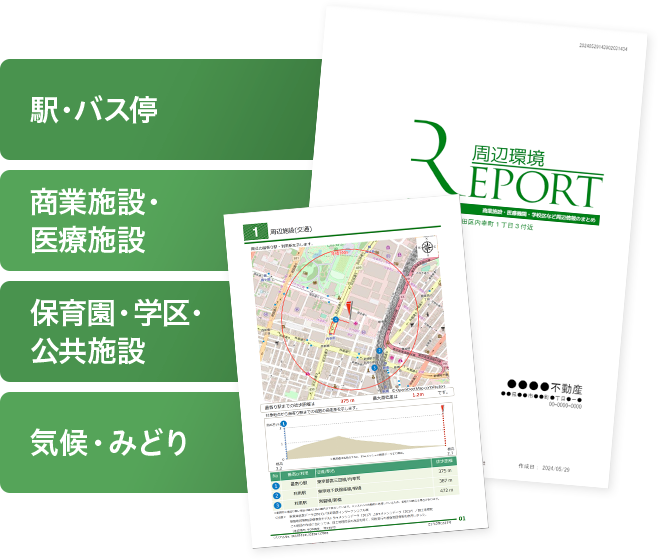 | 物件周辺の施設情報をまとめたレポート ・最寄り駅までの距離、高低差 ・スーパー、コンビニなどのショッピング施設 ・医療、介護施設 ・幼稚園・保育園・小中学区などの教育施設 ・市区役所、公園などの公共施設 ・その他周辺環境 ・気候 ・みどり ・市区町村のシンボル |