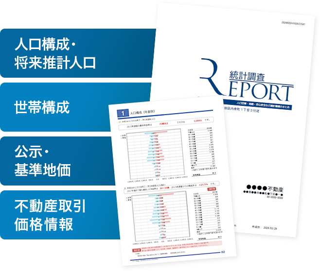 | 人口・世帯などの国勢調査情報や公示・基準地価などをまとめたレポート ・人口構成 ・将来推計人口 ・世帯構成 ・乗降客数 ・商業統計 ・公示・基準地価 ・取引価格情報 |