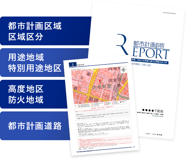 | 用途地域や防火地域など、都市計画をまとめたレポート ・区域/区分 ・用途地域 ・地域/地区/街区 特別用途地区、高度地区、高度利用地区、防火地域、準防火地域、風致地区、地区計画など ・都市計画施設 ・土地区画整理事業 ・その他 法令に基づく制限など |